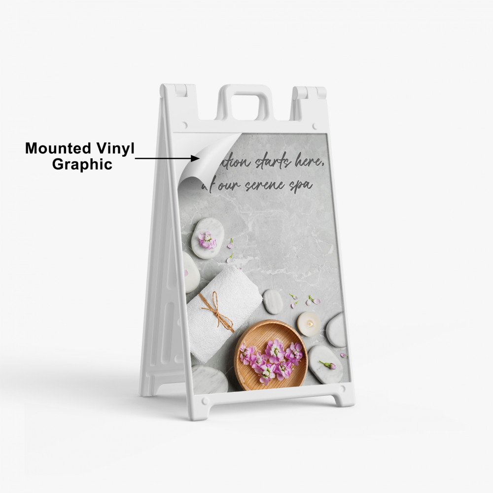 This heavy-duty plastic A-frame is the perfect solution for sidewalk advertising.